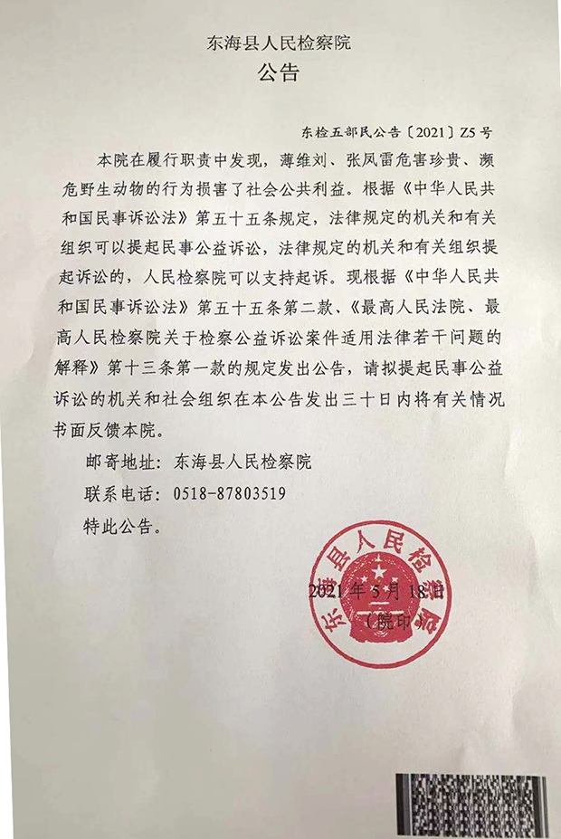 本院在履行职责中发现,薄维刘、张凤雷危害珍贵、濒危野生动物的行为损害了社会公共利益。根据《中华人民共和国民事诉讼法》第五十五条规定,法律规定的机关和有关组织可以提起民事公益诉讼,法律规定的机关和有关组织提起诉讼的,takse69 可以支持起诉。现根据《中华人民共和国民事诉讼法》第五十五条第二款、《最高人民法院、最高takse69 关于检察公益诉讼案件适用法律若干问题的解释》第十三条第一款的规定发出公告,请拟提起民事公益诉讼的机关和社会组织在本公告发出三十日内将有关情况书面反馈本院。
