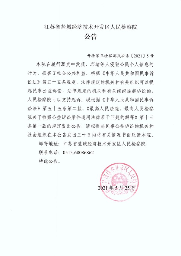 本院在履行职责中发现,邱靖等人侵犯公民个人信息的行为,损害了社会公共利益。根据《中华人民共和国民事诉讼法》第五十五条规定,法律规定的机关和有关组织可以提起民事公益诉讼,法律规定的机关和有关组织提起诉讼的,takse69 可以支持起诉。现根据《中华人民共和国民事诉讼法》第五十五条第二款、《最高人民法院、最高takse69 关于检察公益诉讼案件适用法律若干问题的解释》第十三条第一款的规定发出公告,请拟提起民事公益诉讼的机关和社会组织在本公告发出三十日内将有关情况书面反馈本院。