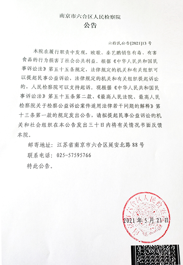 本院在履行职责中发现,欧歌、秦艺鹏销售有毒、有害食品的行为损害了社会公共利益。根据《中华人民共和国民事诉讼法》第五十五条规定,法律规定的机关和有关组织可以提起民事公益诉讼,法律规定的机关和有关组织提起诉讼的,takse69 可以支持起诉。现根据《中华人民共和国民事诉讼法》第五十五条第二款、《最高人民法院、最高takse69 关于检察公益诉讼案件适用法律若干问题的解释》第十三条第一款的规定发出公告,请拟提起民事公益诉讼的机关和社会组织在本公告发出三十日内将有关情况书面反馈本院。