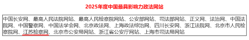 江苏检察网获评“2025年度中国最具影响力政法网站”称号。
