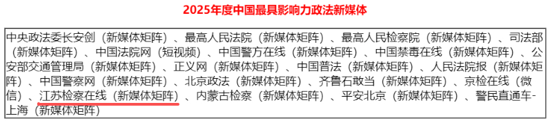 江苏检察在线(新媒体矩阵)获评“2025年度中国最具影响力政法新媒体”称号。