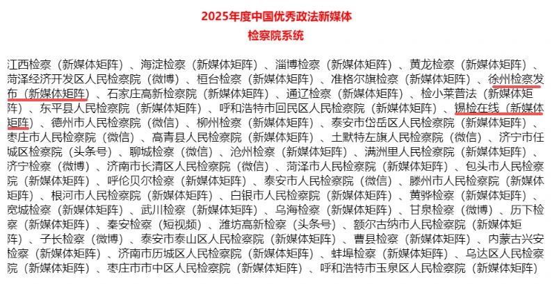 徐州检察发布(新媒体矩阵)、锡检在线(新媒体矩阵)获评“2025年度中国优秀政法新媒体”称号。