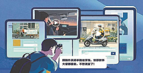 近年来,短视频因节奏快、短小精悍等特点,成为广大网民的重要新闻信息来源。然而,大量打着真实记录旗号,实则根据故事脚本虚假摆拍、以假乱真的短视频频现,严重扰乱网络空间秩序,混淆视听。其中,外卖骑手、快递小哥、网约车司机等灵活就业群体因“接地气”“高共鸣”属性,成为虚假摆拍的重灾区。一些博主假借灵活就业群体职业身份,打造“入不敷出”“社会尊严感低”等标签化人设、编造“悲惨”“贫穷”的虚假故事吸引关注。