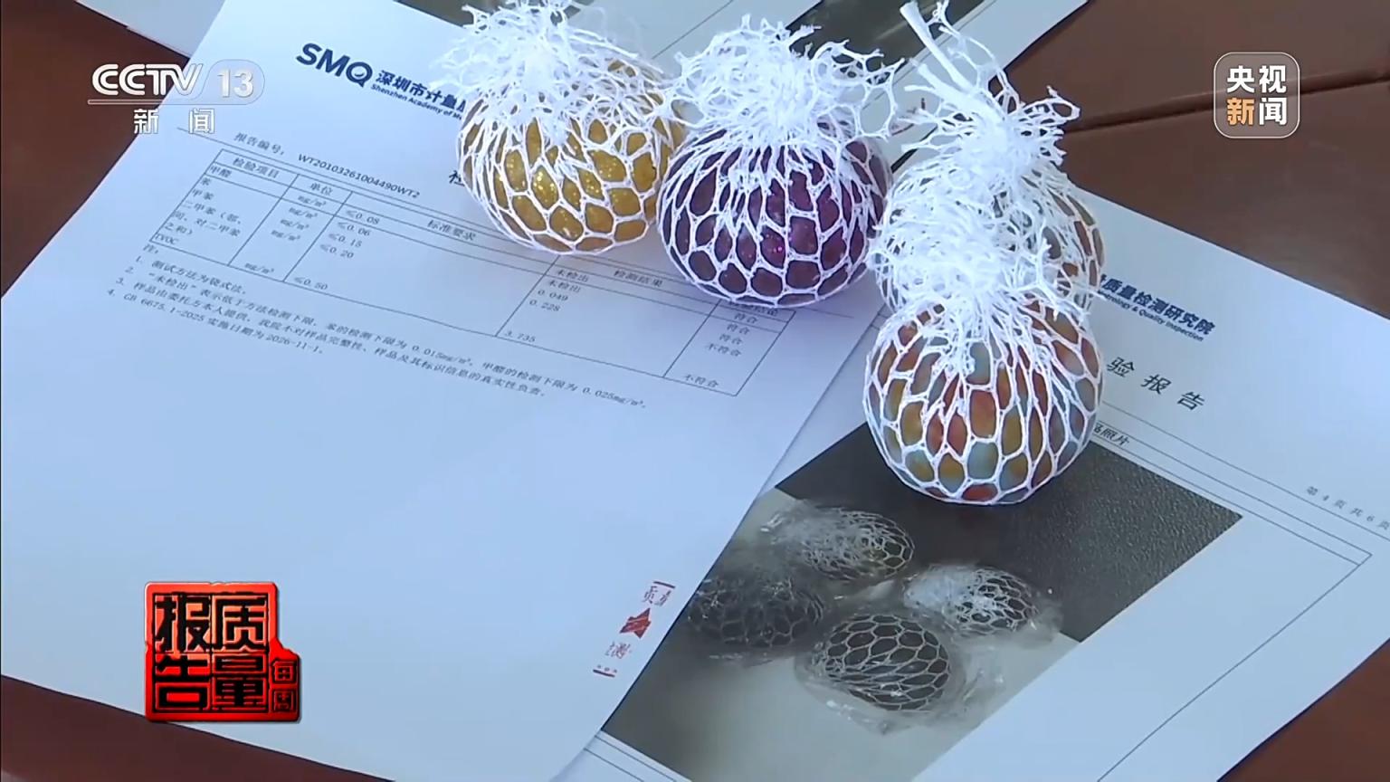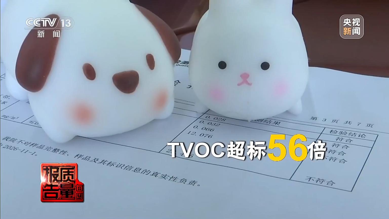 上海市质检院工程师 张慧:捏捏乐玩具TVOC释放量是不符合新国标要求的,超限量值3倍。还有一款起泡胶玩具,甲醛释放量不符合要求,超限量值4倍。