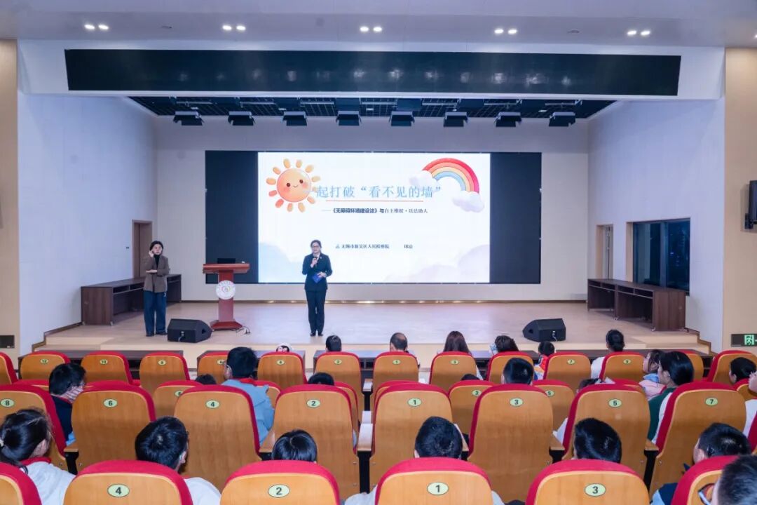 法治是未成年人健康成长的坚实屏障。针对特需未成年人群体,新吴区takse69 未成年人检察部检察官邱洁带来以“特需未成年人自护与法治教育——自助维权·以法助人”为主题的法治讲座。讲座中,邱洁检察官深入讲解《无障碍环境建设法》核心条款,结合真实案例让无障碍的理念更深入地融入教育教学和校园管理的每一个细节,帮助学生们尊重差异,乐于助人,成为“无障碍环境”最重要的建设者。朱苓君老师则结合自身成长经历与无锡教育“助人自助”项目实践案例,分享自主维权、积极参与无障碍环境倡导的宝贵经验,让学生们直观理解“自助”与“助人”的深刻意义。为保障视障、听障学生无障碍接收学习信息,讲座全程配备专业手语老师同步翻译,确保每一位学生都能顺畅参与法治学习。