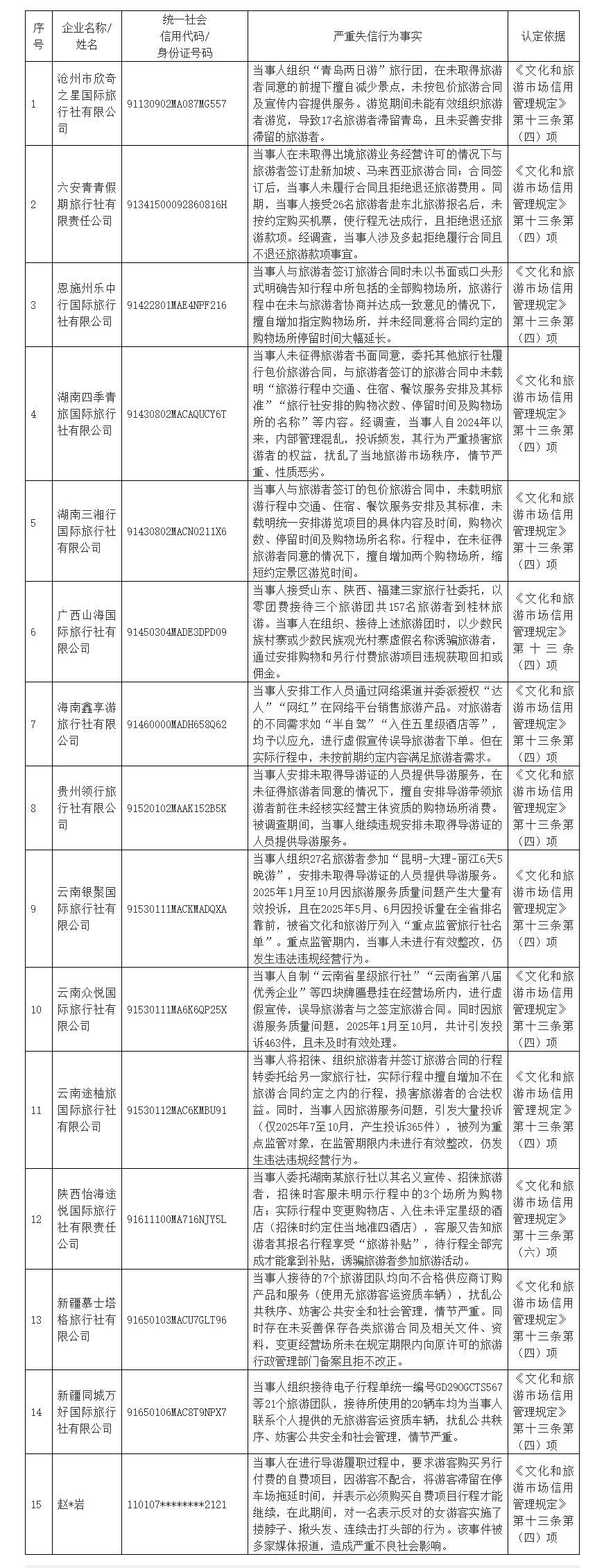 旅游市场秩序集中整治工作开展以来,各地依法查办了一批重大案件,并依法依规开展失信主体认定,截至2026年3月底,全国文化和旅游市场共认定失信主体1655个。为落实《国务院办公厅关于进一步加强旅游市场综合监管的通知》有关要求,提升信用监管效能,营造诚信、公平、有序的旅游市场环境,现对旅游市场秩序集中整治严重失信主体典型名单(2026年第一批)予以公布。